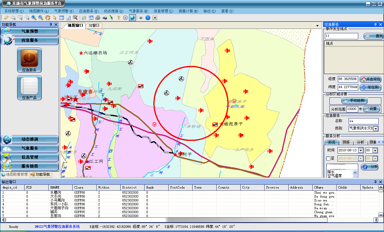 应急分析主要实现对应急地点一定区域范围内的各种因素进行分析,主要包括气象实况预报要素分析,水厂、供水管道、重要经济目标等地理信息分析,全面掌握应急范围内的相关的可能产生影响的信息要素。通过对应急区域内各类信息的深入分析。
